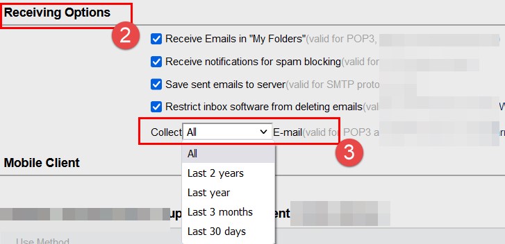 (2)In the Receiving Options, change the default to receive emails from the last 30 days to receive all emails